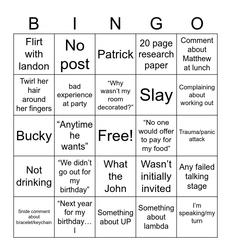 This bingo card has a free space and 24 words: “We didn’t go out for my birthday”, “Next year for my birthday…l, “Why wasn’t my room decorated?”, Snide comment about bracelet/keychain, Comment about Matthew at lunch, Flirt with landon, Twirl her hair around her fingers, No post, “No one would offer to pay for my food”, What the John, Slay, Bucky, Wasn’t initially invited, Any failed talking stage, bad experience at party, Something about lambda, Trauma/panic attack, Patrick, Complaining about working out, “Anytime he wants”, I’m speaking/my turn, Not drinking, 20 page research paper and Something about UP.
