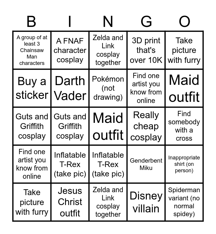 ⚠ This card has duplicate items: Spiderman variant (no normal spidey) (2), Maid outfit (2), Superhero tattoo (2), Zelda and Link cosplay together (2), Inflatable T-Rex (take pic) (2), Stormtrooper (2), A FNAF character cosplay (2), Jack Sparrow (2), Buy a sticker (2), Darth Vader (2), 3D print that's over 10K (2), Inappropriate shirt (on person) (2), Genderbent Miku (2), Find somebody with a cross (2), Niche Arcane cosplays (Not Jinx, Vi, Cait) (2), Pokémon (not drawing) (2), Really cheap cosplay (2), Get someone's Instagram (2), Take picture with furry (2), Guts and Griffith cosplay (2), Disney villain (2), A group of at least 3 Chainsaw Man characters (2), Find one artist you know from online (2), Love Death and Robots cosplay (2)