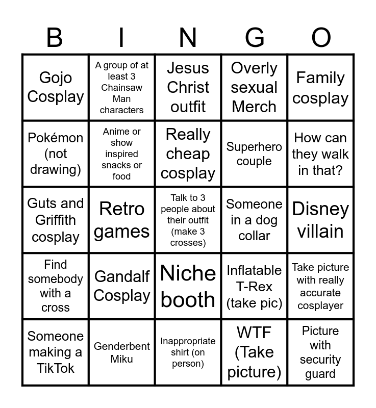 This bingo card has 25 words: Gandalf Cosplay, Inappropriate shirt (on person), Really cheap cosplay, Someone making a TikTok, Family cosplay, Gojo Cosplay, Pokémon (not drawing), A group of at least 3 Chainsaw Man characters, Someone in a dog collar, Niche booth, Superhero couple, Guts and Griffith cosplay, Inflatable T-Rex (take pic), Take picture with really accurate cosplayer, Anime or show inspired snacks or food, Picture with security guard, Disney villain, Jesus Christ outfit, How can they walk in that?, Retro games, Talk to 3 people about their outfit (make 3 crosses), Genderbent Miku, Find somebody with a cross, Overly sexual Merch and WTF (Take picture).