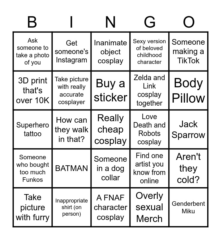 This bingo card has 25 words: BATMAN, A FNAF character cosplay, Buy a sticker, Take picture with furry, Someone making a TikTok, Ask someone to take a photo of you, 3D print that's over 10K, Get someone's Instagram, Love Death and Robots cosplay, Someone in a dog collar, Zelda and Link cosplay together, Superhero tattoo, Find one artist you know from online, Aren't they cold?, Take picture with really accurate cosplayer, Genderbent Miku, Jack Sparrow, Inanimate object cosplay, Body Pillow, How can they walk in that?, Really cheap cosplay, Inappropriate shirt (on person), Someone who bought too much Funkos, Sexy version of beloved childhood character and Overly sexual Merch.