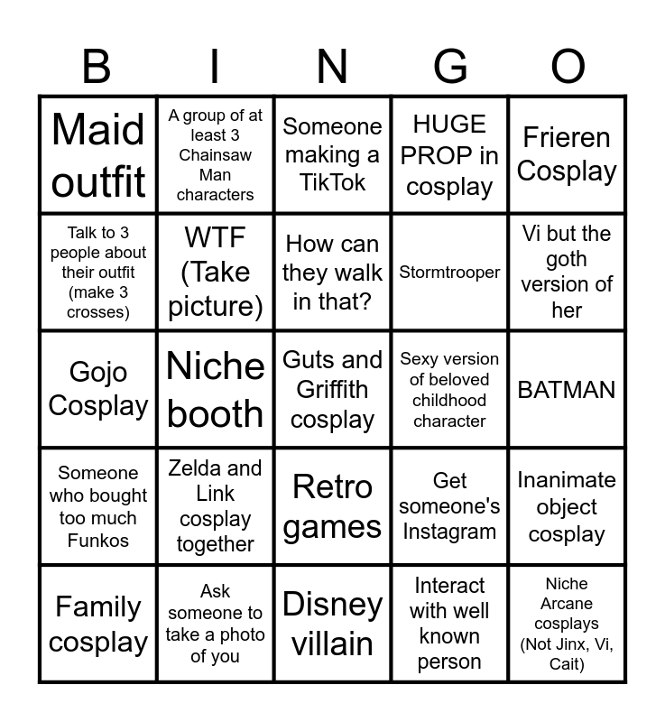 This bingo card has 25 words: Zelda and Link cosplay together, Disney villain, How can they walk in that?, Family cosplay, Frieren Cosplay, Maid outfit, Talk to 3 people about their outfit (make 3 crosses), A group of at least 3 Chainsaw Man characters, Sexy version of beloved childhood character, Retro games, Stormtrooper, Gojo Cosplay, Get someone's Instagram, Inanimate object cosplay, WTF (Take picture), Niche Arcane cosplays (Not Jinx, Vi, Cait), BATMAN, Someone making a TikTok, Vi but the goth version of her, Niche booth, Guts and Griffith cosplay, Ask someone to take a photo of you, Someone who bought too much Funkos, HUGE PROP in cosplay and Interact with well known person.