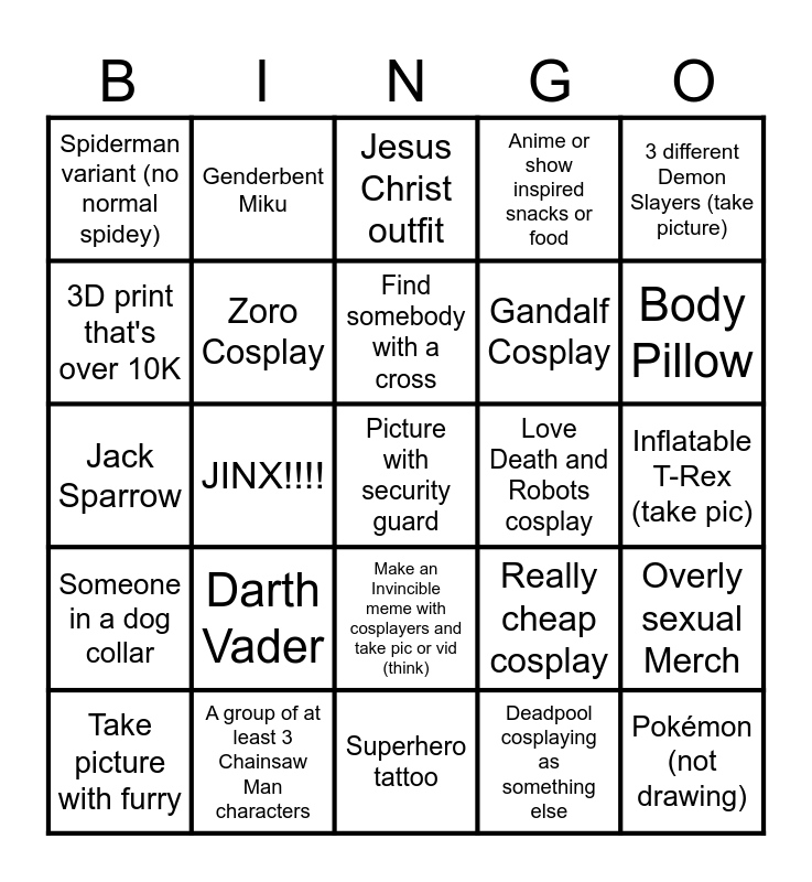 This bingo card has 25 words: Darth Vader, Superhero tattoo, Find somebody with a cross, Take picture with furry, 3 different Demon Slayers (take picture), Spiderman variant (no normal spidey), 3D print that's over 10K, Genderbent Miku, Love Death and Robots cosplay, Make an Invincible meme with cosplayers and take pic or vid (think), Gandalf Cosplay, Jack Sparrow, Really cheap cosplay, Overly sexual Merch, Zoro Cosplay, Pokémon (not drawing), Inflatable T-Rex (take pic), Jesus Christ outfit, Body Pillow, JINX!!!!, Picture with security guard, A group of at least 3 Chainsaw Man characters, Someone in a dog collar, Anime or show inspired snacks or food and Deadpool cosplaying as something else.