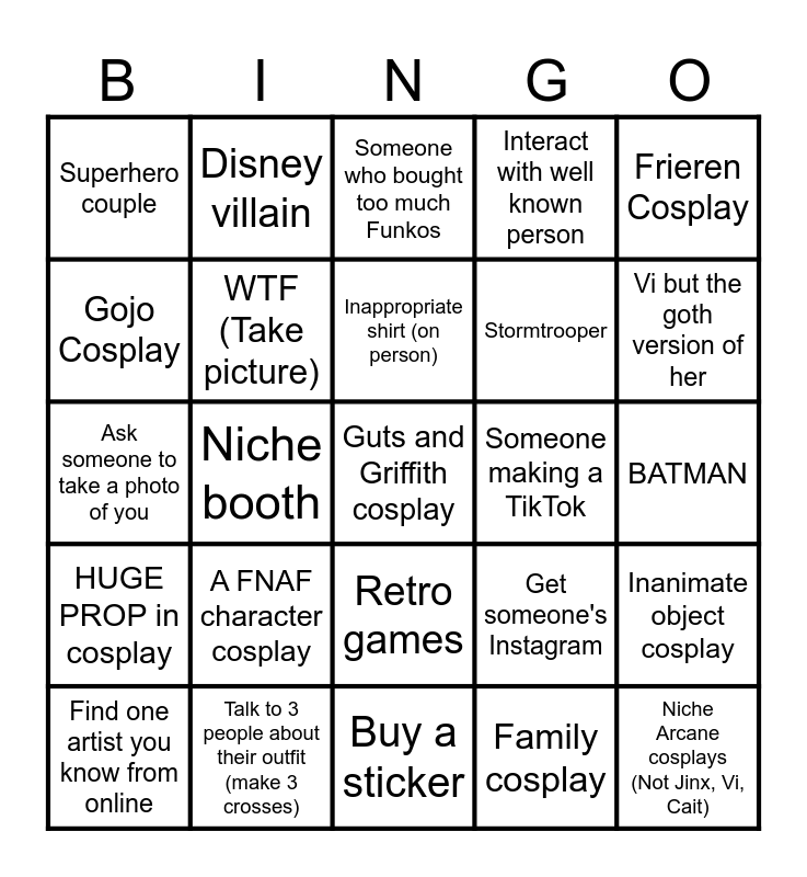 This bingo card has 25 words: A FNAF character cosplay, Buy a sticker, Inappropriate shirt (on person), Find one artist you know from online, Frieren Cosplay, Superhero couple, Gojo Cosplay, Disney villain, Someone making a TikTok, Retro games, Stormtrooper, Ask someone to take a photo of you, Get someone's Instagram, Inanimate object cosplay, WTF (Take picture), Niche Arcane cosplays (Not Jinx, Vi, Cait), BATMAN, Someone who bought too much Funkos, Vi but the goth version of her, Niche booth, Guts and Griffith cosplay, Talk to 3 people about their outfit (make 3 crosses), HUGE PROP in cosplay, Interact with well known person and Family cosplay.