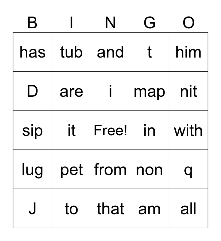 This bingo card has a free space and 30 words: to, have, it, you, has, and, are, from, in, that, with, all, am, ped, nit, rot, non, lug, pet, him, sip, ten, tub, map, D, t, q, J, i and v.