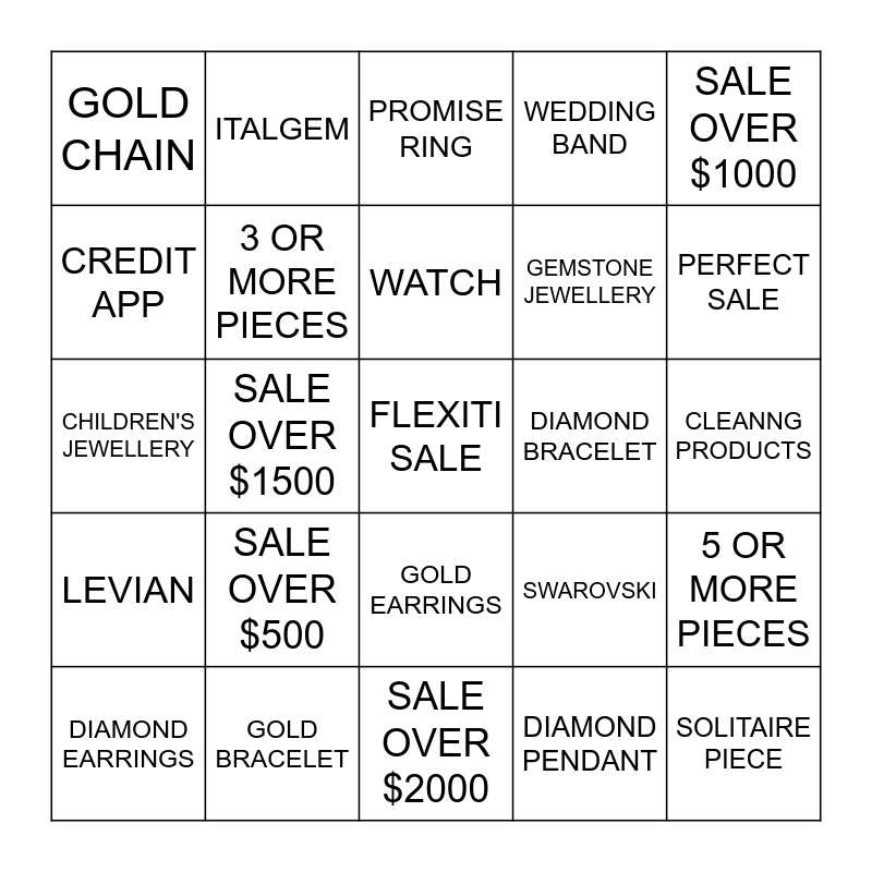 This bingo card has a free space and 24 words: SALE OVER $500, GOLD BRACELET, WATCH, DIAMOND EARRINGS, SALE OVER $1000, GOLD CHAIN, CREDIT APP, ITALGEM, DIAMOND BRACELET, GOLD EARRINGS, GEMSTONE JEWELLERY, CHILDREN'S JEWELLERY, SWAROVSKI, 5 OR MORE PIECES, 3 OR MORE PIECES, DIAMOND PENDANT, CLEANNG PRODUCTS, PROMISE RING, PERFECT SALE, SALE OVER $1500, SOLITAIRE PIECE, LEVIAN, WEDDING BAND and SALE OVER $2000.