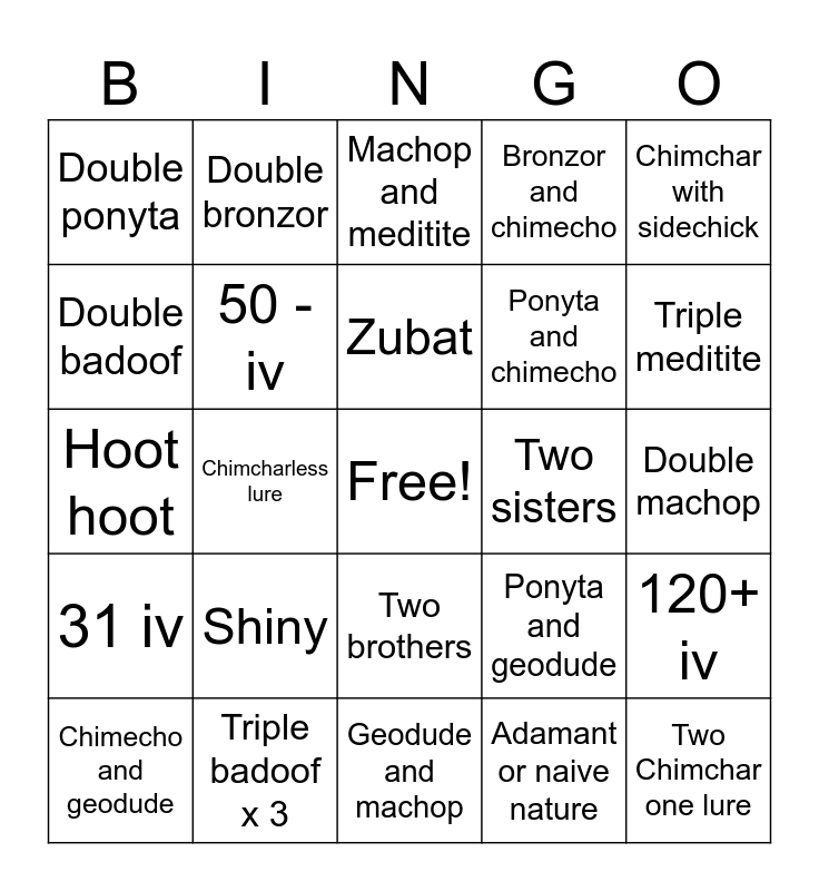 This bingo card has a free space and 24 words: Shiny, Triple badoof x 3, Zubat, Chimecho and geodude, Chimchar with sidechick, Double ponyta, Double badoof, Double bronzor, Two sisters, Two brothers, Ponyta and chimecho, Hoot hoot, Ponyta and geodude, 120+ iv, 50 - iv, Adamant or naive nature, Double machop, Machop and meditite, Triple meditite, Chimcharless lure, Two Chimchar one lure, 31 iv, Bronzor and chimecho and Geodude and machop.