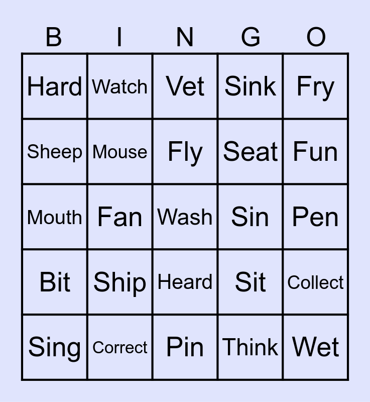 This bingo card has a free space and 24 words: Ship, Correct, Fly, Sing, Fry, Hard, Sheep, Watch, Sin, Heard, Seat, Mouth, Sit, Collect, Mouse, Think, Pen, Vet, Fun, Fan, Wet, Bit, Sink and Pin.