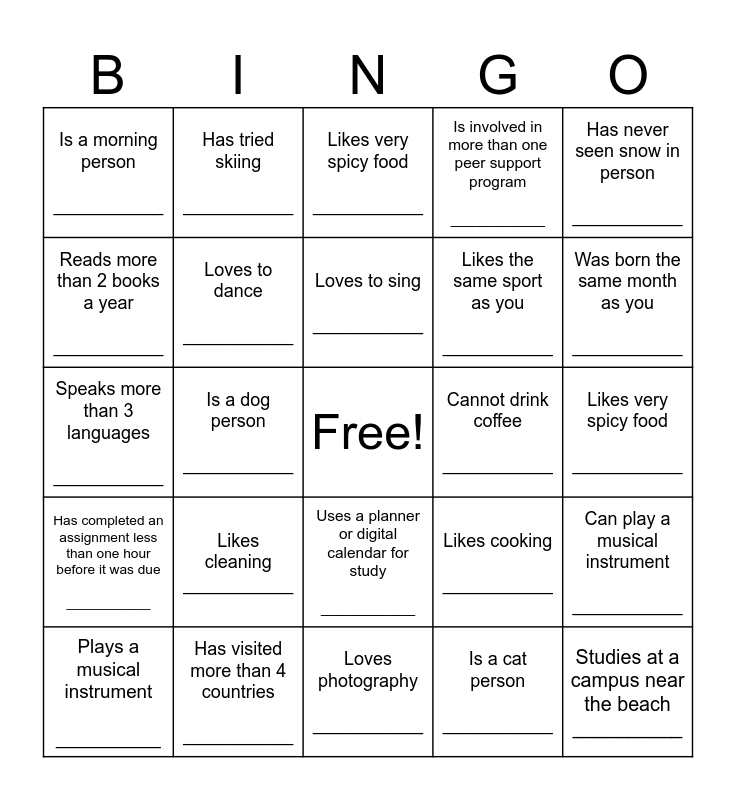 This bingo card has a free space and 44 words: Has visited more than three Australian states ____________, Studies at a campus near the beach __________, Can sleep more than 10 hours __________, Plays a musical instrument __________, Has tried food from at least five different cultures ___________, Is a cat person ___________, Likes very spicy food ___________, Has met the Vice-Chancellor ___________, Has never seen snow in person ___________, Has visited more than 4 countries ___________, Is involved in more than one peer support program ___________, Cannot drink coffee ___________, Uses a planner or digital calendar for study ___________, Likes cleaning ___________, Is scared of birds ___________, Loves photography ___________, Was born the same month as you ___________, Speaks more than 3 languages ___________, Prefers a group studying ___________, Was born the same month as you ___________, Has tried skiing ___________, Likes to exercise ___________, Prefers tea more than coffee ___________, Is a morning person ___________, Has visited the Sydney Opera House ___________, Likes very spicy food ___________, Can name 2 PAT members __________, Has visited more than 3 countries ___________, Likes cooking ___________, Has completed an assignment less than one hour before it was due ___________, Loves coffee ___________, Can play a musical instrument ___________, Is wearing black socks ___________, Was born on the same day as you (Mon, Tue) ___________, Is a dog person ___________, Prefers outdoor activities over indoor ___________, Has ever lost Wi-Fi during a Zoom or Teams meeting ___________, doesn't like chocolate ___________, Loves to sing ___________, Reads more than 2 books a year ___________, Likes the same sport as you ___________, Was born in May ___________, Loves to dance ___________ and Has attended online class in their pyjamas ___________.
