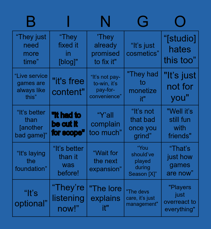 This bingo card has a free space and 24 words: “It’s better than it was before!, “They’re listening now!”, “It’s not pay-to-win, it’s pay-for-convenience”, “It’s optional”, “[studio] hates this too”, “They just need more time”, “Live service games are always like this”, “They fixed it in [blog]", “It’s not that bad once you grind”, “Wait for the next expansion”, "They had to monetize it", “It’s better than [another bad game]”, “You should’ve played during Season [X]”, “That’s just how games are now”, "it's free content", "The devs care, it’s just management", "Well it’s still fun with friends", 'They already promised to fix it", "It’s just not for you", "It had to be cut it for scope", "Players just overreact to everything", “It's laying the foundation”, “It’s just cosmetics” and "The lore explains it".