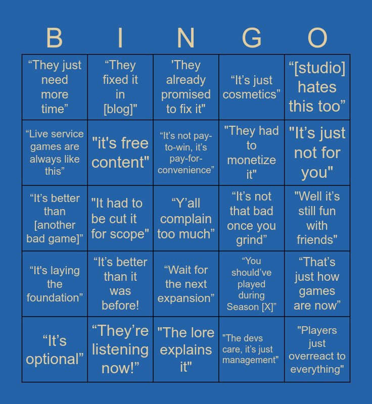 This bingo card has a free space and 24 words: “It’s better than it was before!, “They’re listening now!”, “It’s not pay-to-win, it’s pay-for-convenience”, “It’s optional”, “[studio] hates this too”, “They just need more time”, “Live service games are always like this”, “They fixed it in [blog]", “It’s not that bad once you grind”, “Wait for the next expansion”, "They had to monetize it", “It’s better than [another bad game]”, “You should’ve played during Season [X]”, “That’s just how games are now”, "it's free content", "The devs care, it’s just management", "Well it’s still fun with friends", 'They already promised to fix it", "It’s just not for you", "It had to be cut it for scope", "Players just overreact to everything", “It's laying the foundation”, “It’s just cosmetics” and "The lore explains it".
