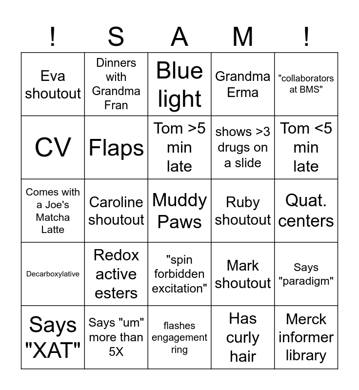 This bingo card has 30 words: Says "um" more than 5X, pottery, Caroline shoutout, Near IR light, Eva shoutout, Blue light, Flaps, "spin forbidden excitation", Ruby shoutout, flashes engagement ring, Quat. centers, Muddy Paws, Has curly hair, Merck informer library, Tom <5 min late, hydro-delogenation, Mark shoutout, Decarboxylative, Redox active esters, "collaborators at BMS", Comes with a Joe's Matcha Latte, Johns Hopkins, Dinners with Grandma Fran, shows >3 drugs on a slide, CV, Grandma Erma, Says "paradigm", Says "XAT", Tom >5 min late and Stavros shoutout.