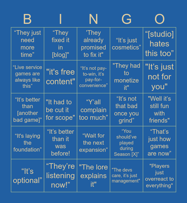 This bingo card has a free space and 24 words: “It’s better than it was before!, “They’re listening now!”, “It’s not pay-to-win, it’s pay-for-convenience”, “It’s optional”, “[studio] hates this too”, “They just need more time”, “Live service games are always like this”, “They fixed it in [blog]", “It’s not that bad once you grind”, “Wait for the next expansion”, "They had to monetize it", “It’s better than [another bad game]”, “You should’ve played during Season [X]”, “That’s just how games are now”, "it's free content", "The devs care, it’s just management", "Well it’s still fun with friends", 'They already promised to fix it", "It’s just not for you", "It had to be cut it for scope", "Players just overreact to everything", “It's laying the foundation”, “It’s just cosmetics” and "The lore explains it".