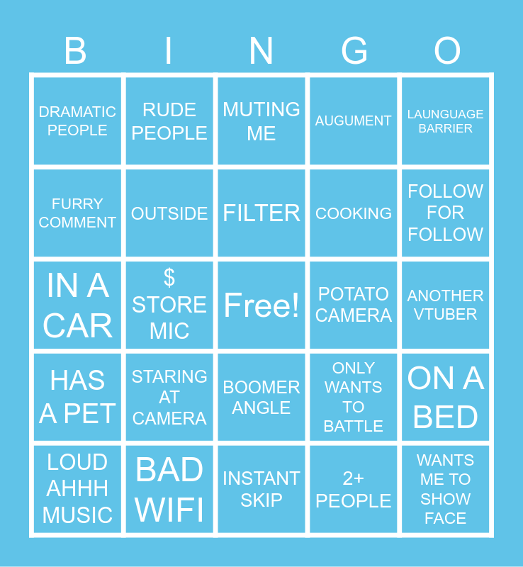 This bingo card has a free space and 24 words: STARING AT CAMERA, BAD WIFI, FILTER, LOUD AHHH MUSIC, LAUNGUAGE BARRIER, DRAMATIC PEOPLE, FURRY COMMENT, RUDE PEOPLE, POTATO CAMERA, BOOMER ANGLE, COOKING, IN A CAR, ONLY WANTS TO BATTLE, ON A BED, OUTSIDE, 2+ PEOPLE, ANOTHER VTUBER, MUTING ME, FOLLOW FOR FOLLOW, $ STORE MIC, WANTS ME TO SHOW FACE, HAS A PET, AUGUMENT and INSTANT SKIP.