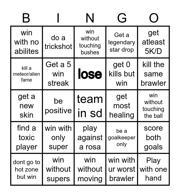 This bingo card has 35 words: Get a kudo, Get star player, play against an 80k player, Get a 5 win streak, play against a rosa, Get a legendary star drop, kill a meteor/alien fame, win with randoms, lose, get 9 cubes in sd, get a new skin, get atleast 5K/D, Win a game (free), win with flipped controls, win with no abilites, get most healing, win with ur worst brawler, be positive, find a toxic player, team in sd, be a goalkeeper only, dont go to hot zone but win, score both goals, win without supers, win without touching bushes, kill the same brawler, Play with one hand, play surge but only stage1, get 0 kills but win, win without touching the ball, Win kit in heist, win without moving, win with only super, do a trickshot and do a cool trick.