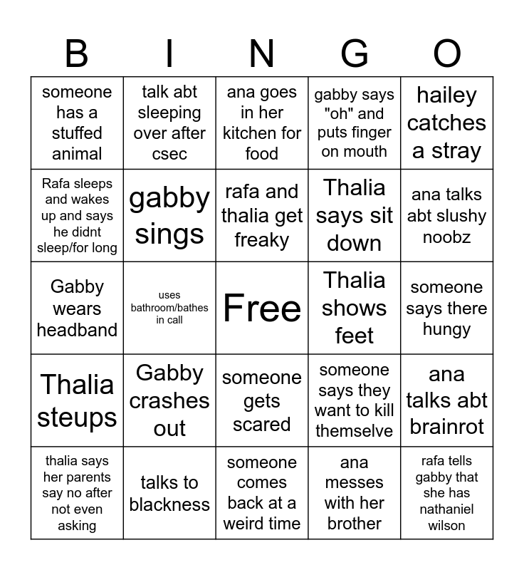 This bingo card has a free space and 24 words: Gabby crashes out, talks to blackness, rafa and thalia get freaky, thalia says her parents say no after not even asking, hailey catches a stray, someone has a stuffed animal, Rafa sleeps and wakes up and says he didnt sleep/for long, talk abt sleeping over after csec, Thalia shows feet, someone gets scared, Thalia says sit down, Gabby wears headband, someone says they want to kill themselve, ana talks abt brainrot, gabby sings, ana messes with her brother, someone says there hungy, ana goes in her kitchen for food, ana talks abt slushy noobz, uses bathroom/bathes in call, rafa tells gabby that she has nathaniel wilson, Thalia steups, gabby says "oh" and puts finger on mouth and someone comes back at a weird time.