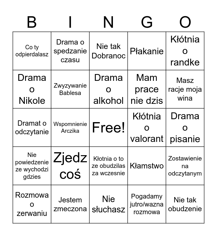 This bingo card has a free space and 24 words: Zjedz coś, Jestem zmeczona, Drama o alkohol, Rozmowa o zerwaniu, Kłótnia o randke, Co ty odpierdalasz, Drama o Nikole, Drama o spedzanie czasu, Kłótnia o valorant, Kłotnia o to ze obudzilas za wczesnie, Mam prace nie dzis, Dramat o odczytanie, Kłamstwo, Zostawienie na odczytanym, Zwyzywanie Bablesa, Pogadamy jutro/wazna rozmowa, Drama o pisanie, Nie tak Dobranoc, Masz racje moja wina, Wspomnienie Arczika, Nie tak obudzenie, Nie powiedzenie ze wychodzi gdzies, Płakanie and Nie słuchasz.