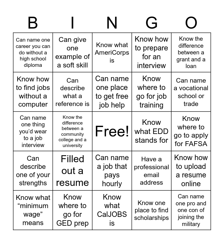 This bingo card has a free space and 25 words: Filled out a resume, Know what CalJOBS is, Can name one place to get free job help, Know what “minimum wage” means, Know the difference between a grant and a loan, Can name one career you can do without a high school diploma, Know how to find jobs without a computer, Can give one example of a soft skill, Know what EDD stands for, Can name a job that pays hourly, Know where to go for job training, Can name one thing you’d wear to a job interview, Have a professional email address, Know how to upload a resume online, Can describe what a reference is, Know one reason to stay in touch with a school counselor, Know where to go to apply for FAFSA, Know what AmeriCorps is, Can name a vocational school or trade, Know the difference between a community college and a university, Can name one pro and one con of joining the military, Know where to go for GED prep, Can describe one of your strengths, Know how to prepare for an interview and Know one place to find scholarships.