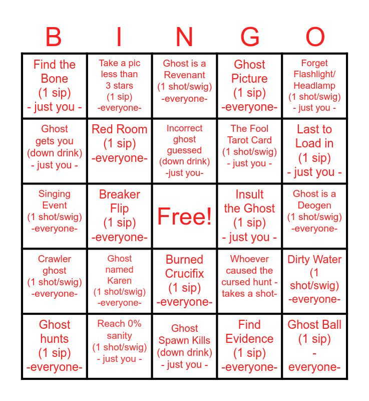 This bingo card has a free space and 24 words: Ghost named Karen (1 shot/swig) -everyone-, Reach 0% sanity (1 shot/swig) - just you -, Incorrect ghost guessed (down drink) -just you-, Ghost hunts (1 sip) -everyone-, Forget Flashlight/ Headlamp (1 shot/swig) - just you -, Find the Bone (1 sip) - just you -, Ghost gets you (down drink) - just you -, Take a pic less than 3 stars (1 sip) -everyone-, Insult the Ghost (1 sip) - just you -, Burned Crucifix (1 sip) -everyone-, The Fool Tarot Card (1 shot/swig) - just you -, Singing Event (1 shot/swig) -everyone-, Whoever caused the cursed hunt -takes a shot-, Dirty Water (1 shot/swig) -everyone-, Red Room (1 sip) -everyone-, Find Evidence (1 sip) -everyone-, Ghost is a Deogen (1 shot/swig) -everyone-, Ghost is a Revenant (1 shot/swig) -everyone-, Last to Load in (1 sip) - just you -, Breaker Flip (1 sip) -everyone-, Ghost Ball (1 sip) -everyone-, Crawler ghost (1 shot/swig) -everyone-, Ghost Picture (1 sip) -everyone- and Ghost Spawn Kills (down drink) - just you -.