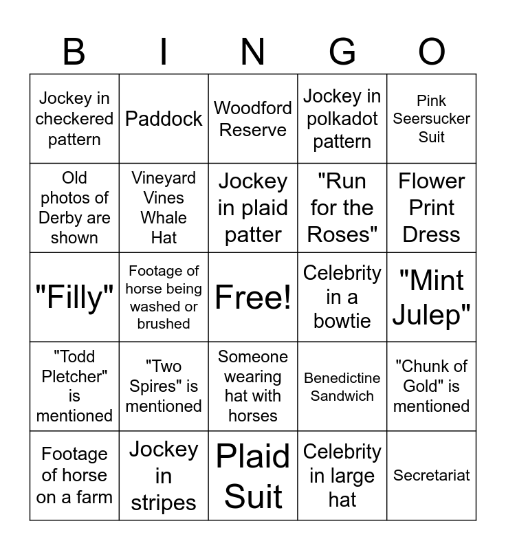 This bingo card has a free space and 26 words: Someone wearing hat with horses, Celebrity in large hat, Jockey in plaid patter, Jockey in stripes, Pink Seersucker Suit, Jockey in checkered pattern, Old photos of Derby are shown, Paddock, "Mint Julep", Benedictine Sandwich, "Run for the Roses", "Filly", "Chunk of Gold" is mentioned, Footage of horse on a farm, Footage of horse being washed or brushed, Toby Keith on screen, Jockey in polkadot pattern, "Todd Pletcher" is mentioned, Woodford Reserve, Secretariat, Flower Print Dress, Plaid Suit, Celebrity in a bowtie, "Two Spires" is mentioned, Vineyard Vines Whale Hat and "And They're Off!".
