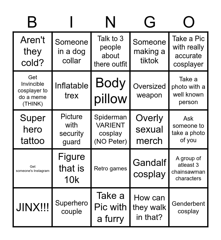 This bingo card has 25 words: Figure that is 10k, Take a Pic with a furry, Body pillow, JINX!!!, Take a Pic with really accurate cosplayer, Aren't they cold?, Get Invincible cosplayer to do a meme (THINK), Someone in a dog collar, Overly sexual merch, Retro games, Oversized weapon, Super hero tattoo, Gandalf cosplay, A group of atleast 3 chainsawman characters, Inflatable trex, Genderbent cosplay, Ask someone to take a photo of you, Talk to 3 people about there outfit, Take a photo with a well known person, Picture with security guard, Spiderman VARIENT cosplay (NO Peter), Superhero couple, Get someone's Instagram, Someone making a tiktok and How can they walk in that?.