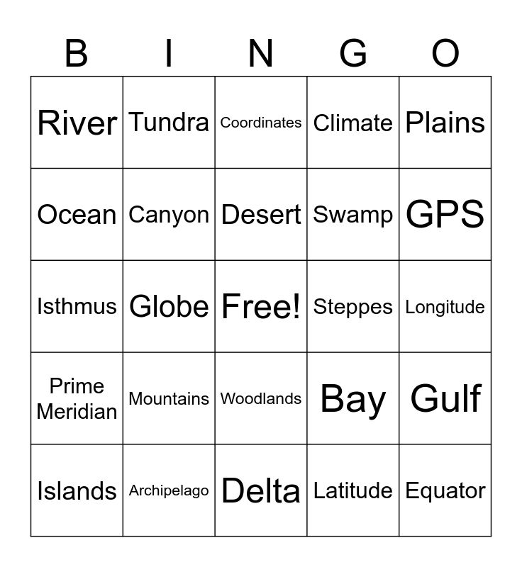 This bingo card has a free space and 24 words: Mountains, Archipelago, Desert, Islands, Plains, River, Ocean, Tundra, Steppes, Woodlands, Swamp, Isthmus, Bay, Gulf, Canyon, Latitude, Longitude, Coordinates, GPS, Globe, Equator, Prime Meridian, Climate and Delta.