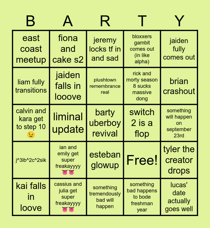 This bingo card has 25 words: ian and emily get super freakayyyy π π , something tremendously bad will happen, plushtown remembrance real, kai falls in loove, jaiden fully comes out, east coast meetup, liam fully transitions, fiona and cake s2, switch 2 is a flop, esteban glowup, rick and morty season 8 sucks massive dong, calvin and kara get to step 10 π, Free!, tyler the creator drops, jaiden falls in looove, lucas' date actually goes well, something will happen on september 23rd, jeremy locks tf in and sad, brian crashout, liminal update, barty uberboy revival, cassius and julia get super freakayyyy π π , j^3lb^2c^2sik, bloxxers gambit comes out (in like alpha) and something bad happens to bode freshman year.