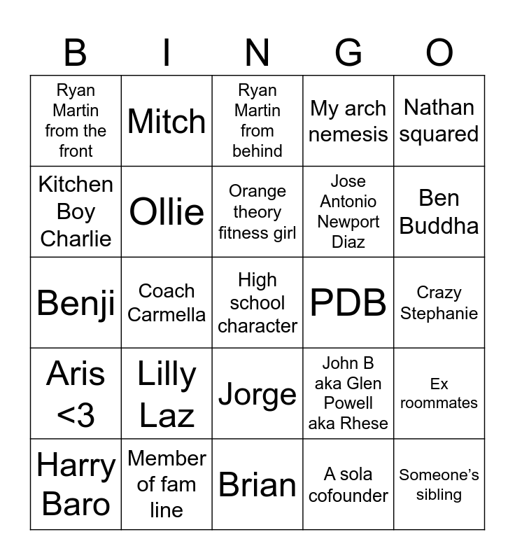 This bingo card has a free space and 24 words: Lilly Laz, Member of fam line, Orange theory fitness girl, Harry Baro, Nathan squared, Ryan Martin from the front, Kitchen Boy Charlie, Mitch, PDB, Jorge, Jose Antonio Newport Diaz, Benji, John B aka Glen Powell aka Rhese, Ex roommates, Ollie, A sola cofounder, Crazy Stephanie, Ryan Martin from behind, Ben Buddha, Coach Carmella, Someone’s sibling, Aris <3, My arch nemesis and Brian.