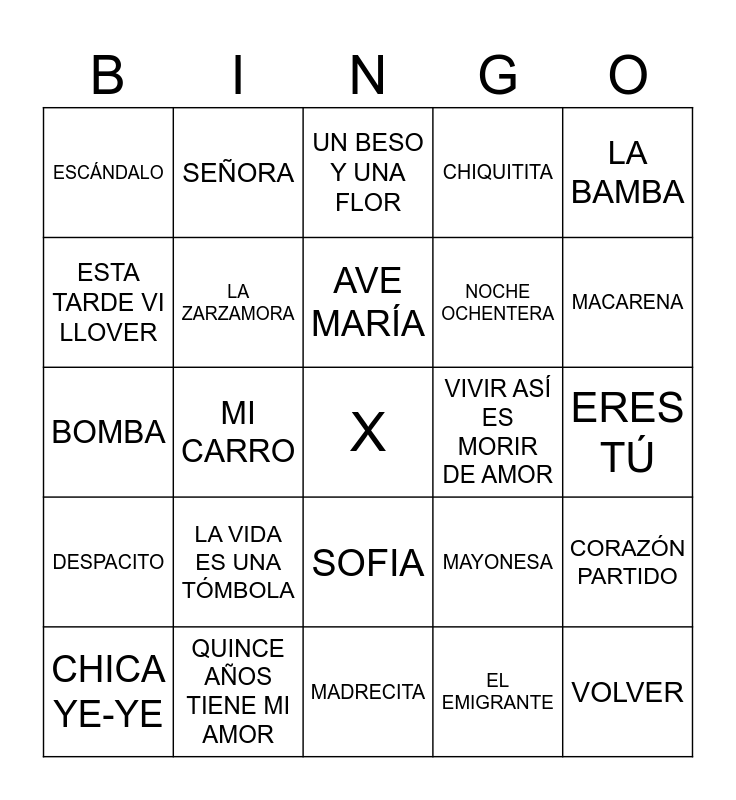This bingo card has a free space and 29 words: CHICA YE-YE, LA PUERTA DE ALCALÁ, MI CARRO, COMO UNA OLA, ESCÁNDALO, UN BESO Y UNA FLOR, LA ZARZAMORA, LA VIDA ES UNA TÓMBOLA, VIVIR ASÍ ES MORIR DE AMOR, QUINCE AÑOS TIENE MI AMOR, ERES TÚ, VOLVER, MADRECITA, EL EMIGRANTE, MACARENA, WAKA WAKA, SOFIA, DESPACITO, LA BAMBA, BOMBA, MAYONESA, ECHA PA´LLA, NOCHE OCHENTERA, ESTA TARDE VI LLOVER, CHIQUITITA, SEÑORA, CORAZÓN PARTIDO, AVE MARÍA and AMANTE BANDIDO.