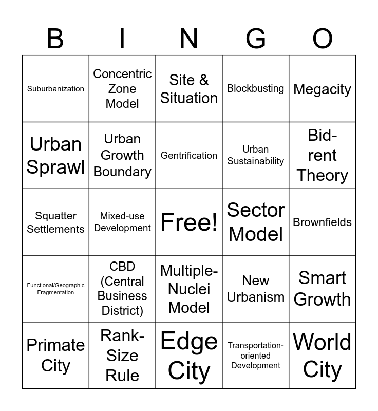 This bingo card has a free space and 25 words: CBD (Central Business District), Edge City, Gentrification, Primate City, Megacity, Suburbanization, Urban Sprawl, Concentric Zone Model, Sector Model, Multiple-Nuclei Model, Urban Sustainability, Squatter Settlements, New Urbanism, Smart Growth, Urban Growth Boundary, Redlining, Brownfields, Site & Situation, Bid-rent Theory, Mixed-use Development, World City, Rank-Size Rule, Functional/Geographic Fragmentation, Blockbusting and Transportation-oriented Development.