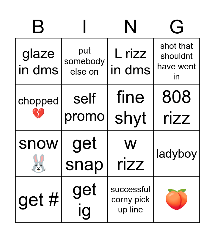 This bingo card has 16 words: get ig, ladyboy, L rizz in dms, glaze in dms, snow🐰, put somebody else on, w rizz, successful corny pick up line, chopped 💔, self promo, get #, shot that shouldnt have went in, get snap, 808 rizz, fine shyt and 🍑.