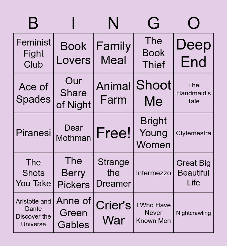This bingo card has a free space and 31 words: Crier's War, The Maidens, Dear Mothman, Beautiful World, Where Are You, Feminist Fight Club, Family Meal, Our Share of Night, Intermezzo, Bright Young Women, I Who Have Never Known Men, Clytemestra, Nightcrawling, Sunrise on the Reaping, My Brilliant Friend, The Handmaid's Tale, Quicksilver, Great Big Beautiful Life, The Berry Pickers, The Shots You Take, Strange the Dreamer, Deep End, The Night Circus, Aristotle and Dante Discover the Universe, Book Lovers, Shoot Me, Ace of Spades, The Book Thief, Piranesi, Anne of Green Gables, Animal Farm and Lullabies for Little Criminals.