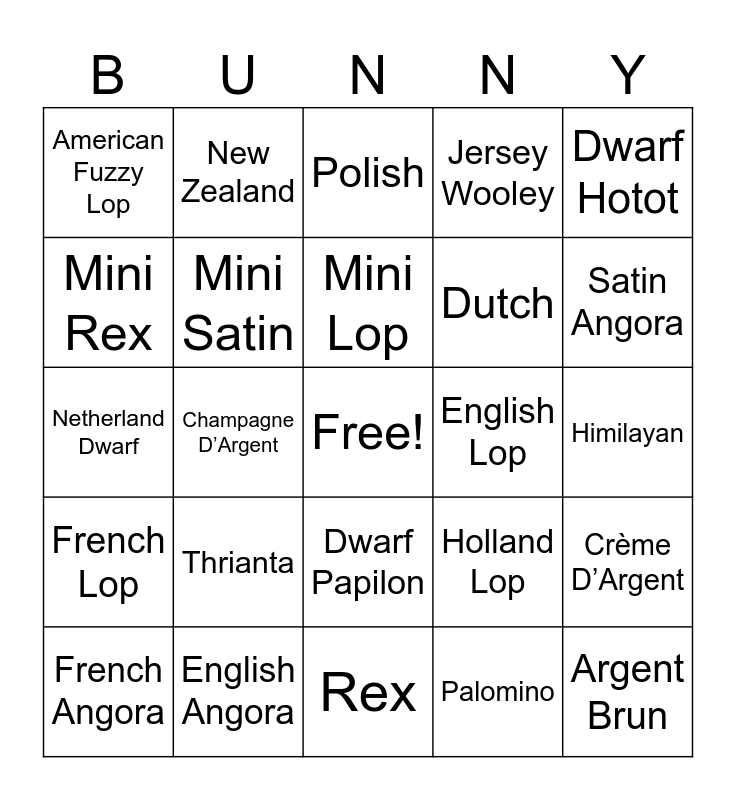 This bingo card has a free space and 27 words: Holland Lop, Califonian, Dutch, Rex, Mini Rex, Polish, New Zealand, French Lop, English Lop, Crème D’Argent, Netherland Dwarf, Jersey Wooley, French Angora, English Angora, Satin Angora, Satin, Mini Satin, Mini Lop, Thrianta, American Fuzzy Lop, Himilayan, Palomino, Champagne D’Argent, Argent Brun, Dwarf Papilon, Dwarf Hotot and American.