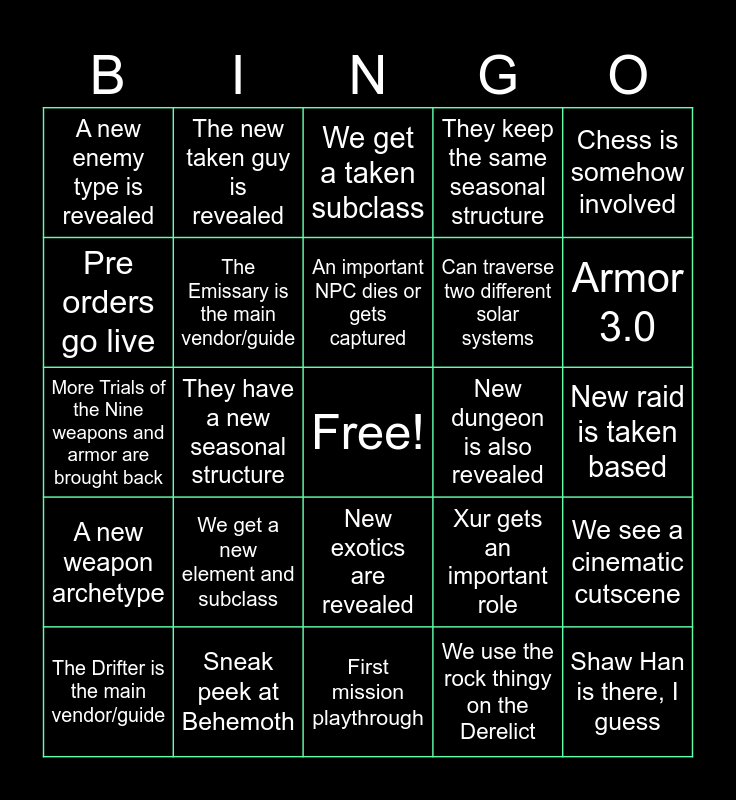 This bingo card has a free space and 24 words: The Drifter is the main vendor/guide, We get a new element and subclass, An important NPC dies or gets captured, We use the rock thingy on the Derelict, Chess is somehow involved, A new enemy type is revealed, The new taken guy is revealed, We get a taken subclass, New dungeon is also revealed, New raid is taken based, More Trials of the Nine weapons and armor are brought back, The Emissary is the main vendor/guide, Xur gets an important role, We see a cinematic cutscene, Pre orders go live, Sneak peek at Behemoth, First mission playthrough, They keep the same seasonal structure, Armor 3.0, A new weapon archetype, They have a new seasonal structure, New exotics are revealed, Can traverse two different solar systems and Shaw Han is there, I guess.