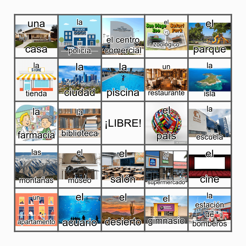 This bingo card has 30 images, a free space and 30 words: el acuario, el banco, la biblioteca, el bosque, una casa, el centro comercial, la ciudad, el salón, el país, el desierto, la escuela, la estación de bomberos, el gimnasio, el hotel, la isla, el lago, el supermercado, las montañas, el museo, el parque, la farmacia, la playa, la policía, un restaurante, la tienda, el zoológico, el cine, un apartamento, la piscina and el hospital.