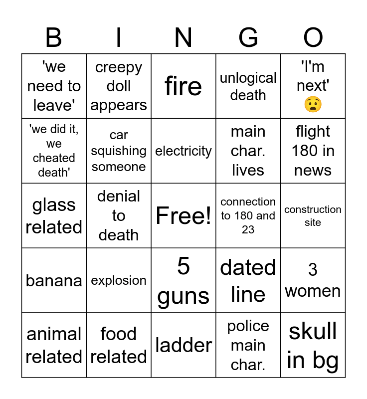 This bingo card has a free space and 24 words: explosion, food related, electricity, animal related, 'I'm next' 😧, 'we need to leave', 'we did it, we cheated death', creepy doll appears, connection to 180 and 23, 5 guns, main char. lives, glass related, dated line, 3 women, car squishing someone, police main char., construction site, fire, flight 180 in news, denial to death, skull in bg, banana, unlogical death and ladder.