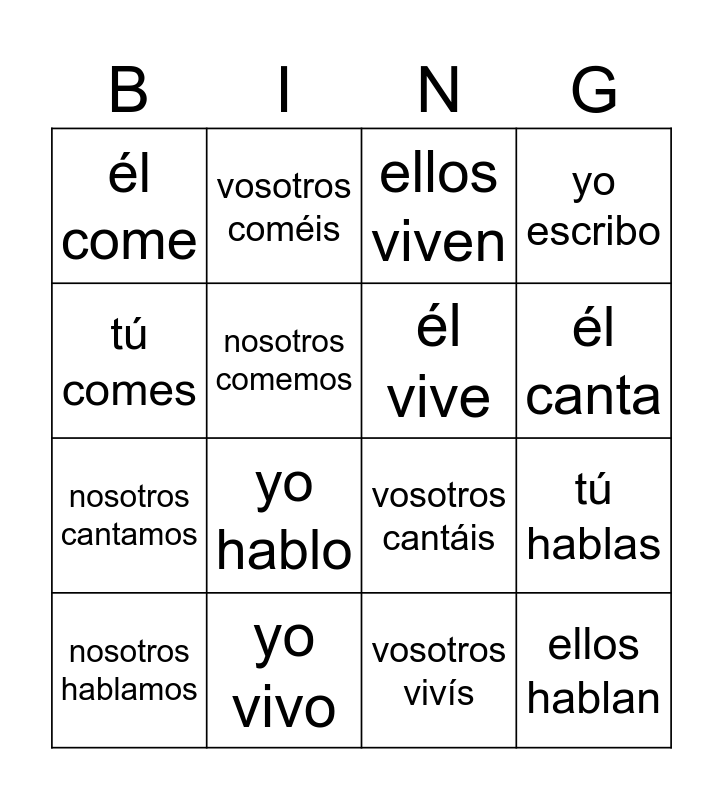 This bingo card has 25 words: yo canto, tú cantas, él canta, yo como, tú comes, él come, nosotros comemos, vosotros coméis, yo vivo, ellos comen, nosotros cantamos, vosotros cantáis, ellos cantan, tú vives, él vive, nosotros vivimos, vosotros vivís, ellos viven, yo hablo, tú hablas, nosotros hablamos, vosotros habláis, ellos hablan, yo escribo and tú escribes.