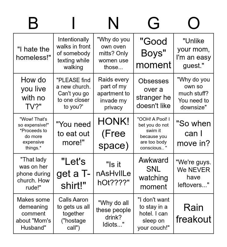 This bingo card has a free space and 34 words: "Wow! You live with the rich snobs", "I don't want to stay in a hotel. I can sleep on your couch!", "Why do live so far out? Please consider moving closer to work...", "Hey, is that the Curb Event Center? I've seen it on TV.", "That lady was on her phone during church. How rude!", "PLEASE find a new church. Can't you go to one closer to you?', "Unlike your mom, I'm an easy guest.", Makes some demeaning comment about "Mom's Husband", Intentionally walks in front of somebody texting while walking, "Your upstairs neighbors are annoying! Let me go chat with them.", Raids every part of my apartment to invade my privacy, "Why do you own oven mitts? Only women use those..., "I hope all of these dogs die!", Hovers over me when I cook Tilapia, "OOH! A Pool! I bet you do not swim it because you are too body conscious.. ", "Why do you own so much stuff? You need to downsize", Calls Aaron to gets us all together ("hostage call"), "Wow! That's so expensive!" *Proceeds to do more expensive things.*, "Let's get a T-shirt!", Awkward SNL watching moment, "Is it nAsHvIlLe hOt????", Freak out on Broadway despite really wanting to go, "I hate the homeless!", "So when can I move in?, "Why do all these people drink? Idiots...", Rain freakout, "Good Boys" moment, "Beep. boop. I. am. a. robot. must. text. 24/7.", Obsesses over a stranger he doesn't like, How do you live with no TV?", Dad-spains, "You need to eat out more!", "We're guys. We NEVER have leftovers..." and "This airport is too busy!".