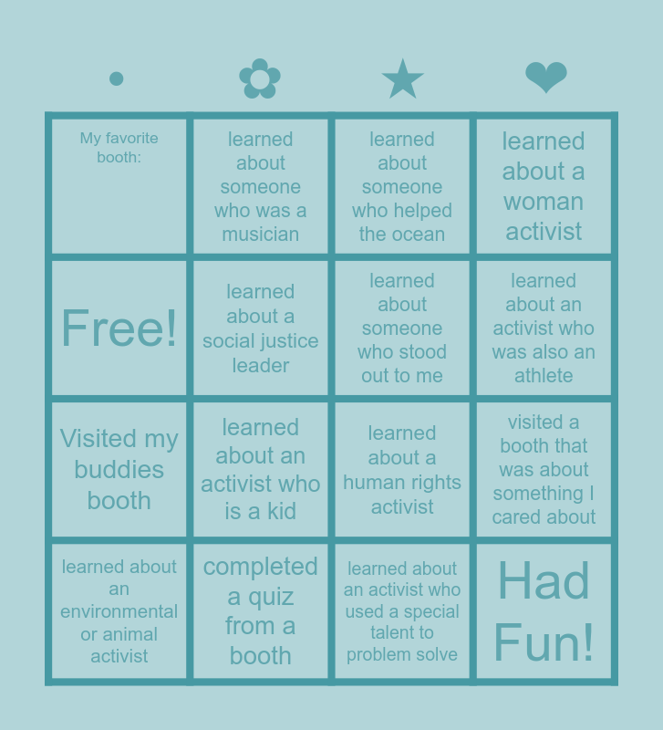 This bingo card has 17 words: learned about an environmental or animal activist, completed a quiz from a booth, learned about someone who helped the ocean, learned about a woman activist, Visited my buddies booth, learned about a social justice leader, learned about a human rights activist, learned about an activist who was also an athlete, Free!, learned about an activist who is a kid, learned about an activist who used a special talent to problem solve, visited a booth that was about something I cared about, My favorite booth:, learned about someone who was a musician, learned about someone who stood out to me, Had Fun! and my favorite booth:.