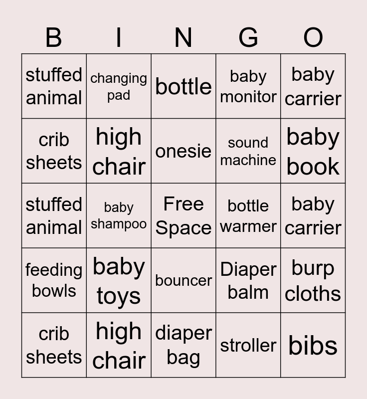 This bingo card has a free space and 49 words: Diapers, baby toys, bouncer, stroller, baby carrier, feeding bowls, changing pad, baby wipes, sound machine, burp cloths, crib sheets, baby shampoo, Diaper balm, bibs, teething ring, pacifier, bottle, bottle warmer, baby book, stuffed animal, high chair, diaper bag, baby monitor, baby carrier, Diapers, baby toys, onesie, stroller, burp cloths, feeding bowls, changing pad, bouncer, sound machine, bibs, crib sheets, baby shampoo, baby wipes, Diaper balm, baby book, teething ring, pacifier, bottle, bottle warmer, hooded towel, stuffed animal, high chair, diaper bag, baby monitor and onesie.