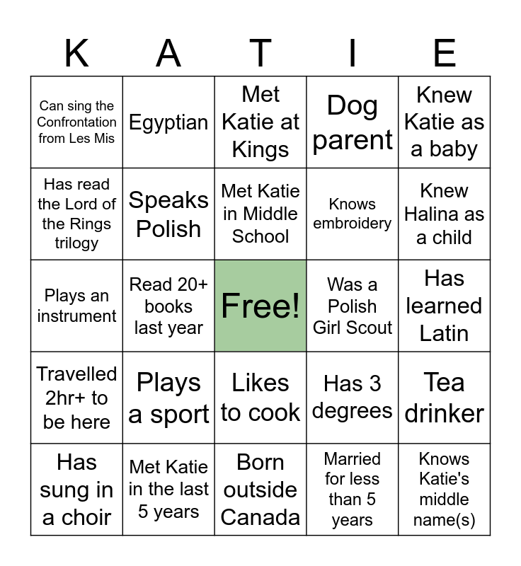 This bingo card has a free space and 34 words: Married for over 30 years, Married for less than 5 years, UofT Grad, Katie's Aunt, Travelled 2hr+ to be here, Speaks Polish, Knew Katie as a baby, Has sung in a choir, Egyptian, Met Katie in High School, Met Katie in Middle School, Met Katie at Kings, Met Katie at UofT, Has a younger brother, Was a Polish Girl Scout, Knew Halina as a child, Met Katie in the last 5 years, Plays an instrument, Plays a sport, Has 3 degrees, Likes to cook, Fluent in a language other than English, Can sing the Confrontation from Les Mis, Has learned Latin, Born outside Canada, Knows Katie's middle name(s), Dog parent, Allergic to cats, Knows embroidery, Has read the Lord of the Rings trilogy, Taller than Katie, Read 20+ books last year, Tea drinker and Plays/played the flute.