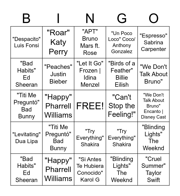 This bingo card has a free space and 48 words: "Shake It Off" Taylor Swift, "Happy" Pharrell Williams, "Let It Go" Frozen /Idina Menzel, "Dance Monkey" Tones and I, "We Don't Talk About Bruno", "Levitating" Dua Lipa, "Roar" Katy Perry, "Good 4 U" Olivia Rodrigo, "Can't Stop the Feeling!", "Sunflower" Post Malone & Swae Lee, "Bad Habits" Ed Sheeran, "Peaches" Justin Bieber, "Believer" Imagine Dragons, "Blinding Lights" The Weeknd, "Cruel Summer" Taylor Swift, "Pink Pony Club" Chappell Roan, "APT" Bruno Mars ft. Rose, "Try Everything" Shakira, "Birds of a Feather" Billie Eilish, "Despacito" Luis Fonsi, "Titi Me Preguntó" Bad Bunny, "Si Antes Te Hubiera Conocido" Karol G, "Un Poco Loco" Coco/ Anthony Gonzalez, "Espresso" Sabrina Carpenter, "Shake It Off" Taylor Swift, "Happy" Pharrell Williams, "Let It Go" Frozen | Idina Menzel, "Dance Monkey" Tones and I, "We Don't Talk About Bruno" Encanto | Disney Cast, "Levitating" Dua Lipa, "Roar" Katy Perry, "Good 4 U" Olivia Rodrigo, "Can't Stop the Feeling!" Justin Timberlake, "Sunflower" Post Malone, "Bad Habits" Ed Sheeran, "Peaches" Justin Bieber, "Believer" Imagine Dragons, "Blinding Lights" The Weeknd, "Cruel Summer" Taylor Swift, "Pink Pony Club" Chappell Roan, "APT" Bruno Mars ft. Rose, "Try Everything" Shakira, "Birds of a Feather" Billie Eilish, "Despacito" Luis Fonsi, "Titi Me Preguntó" Bad Bunny, "Si Antes Te Hubiera Conocido" Karol G, "Un Poco Loco" Coco | Anthony Gonzalez and "Espresso" Sabrina Carpenter.