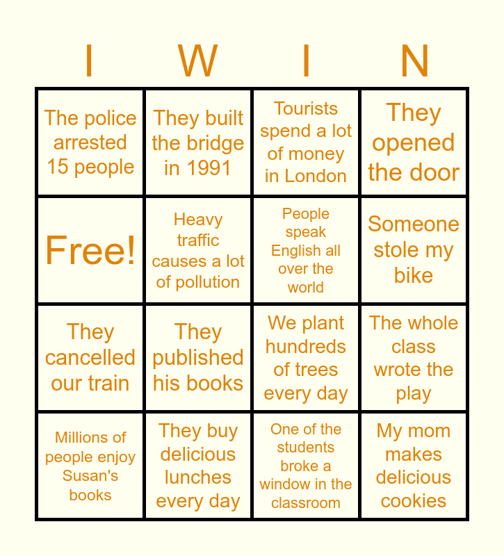 This bingo card has 16 words: They buy delicious lunches every day, The whole class wrote the play, Tourists spend a lot of money in London, The police arrested 15 people, They cancelled our train, They built the bridge in 1991, We plant hundreds of trees every day, One of the students broke a window in the classroom, Free!, Heavy traffic causes a lot of pollution, Millions of people enjoy Susan's books, They opened the door, They published his books, Someone stole my bike, People speak English all over the world and My mom makes delicious cookies.