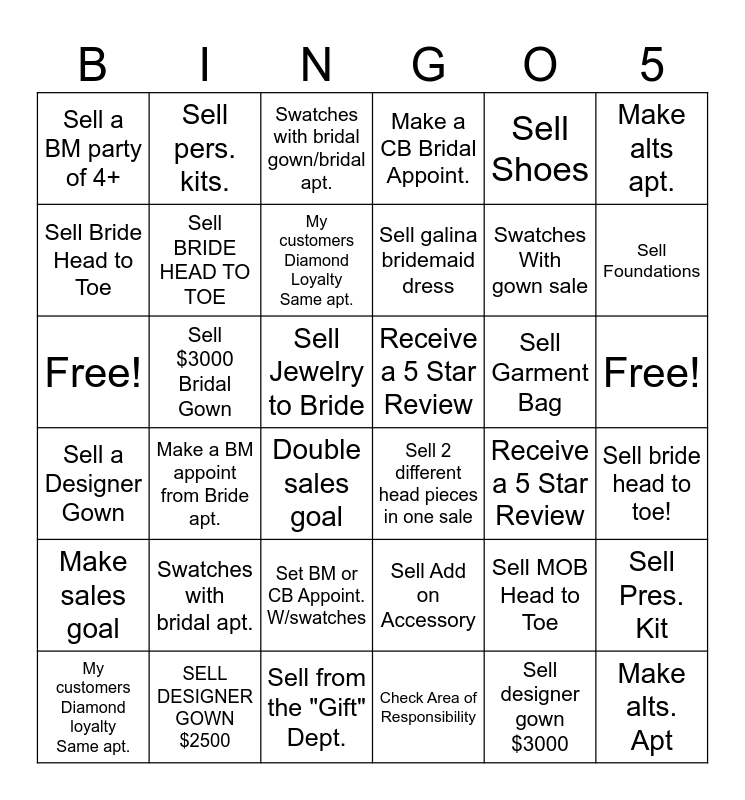 This bingo card has 36 words: Sell Add on Accessory, Set BM or CB Appoint. W/swatches, Check Area of Responsibility, Sell Bride Head to Toe, Sell a Designer Gown, Receive a 5 Star Review, Sell BRIDE HEAD TO TOE, Sell from the "Gift" Dept., Sell Shoes, Sell MOB Head to Toe, Sell Foundations, Make a CB Bridal Appoint., Sell Pres. Kit, Sell $3000 Bridal Gown, Sell galina bridemaid dress, Sell a BM party of 4+, Make sales goal, Sell Garment Bag, Free!, Swatches with bridal gown/bridal apt., Sell Jewelry to Bride, Make a BM appoint from Bride apt., Sell 2 different head pieces in one sale, Double sales goal, Receive a 5 Star Review, Sell pers. kits., Swatches With gown sale, SELL DESIGNER GOWN $2500, My customers Diamond Loyalty Same apt., Make alts apt., Make alts. Apt, My customers Diamond loyalty Same apt., Sell bride head to toe!, Free!, Swatches with bridal apt. and Sell designer gown $3000.