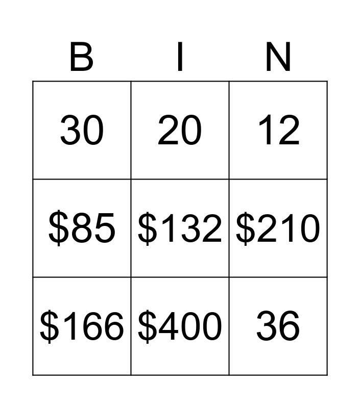 This bingo card has 16 words: Free!, 15, 12, 30, 36, 20, $180, $345, $132, $210, $562, $85, $225, $400, $166 and $608.