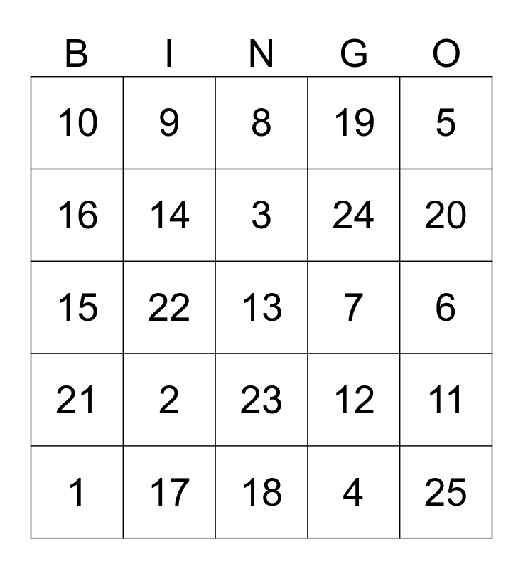 This bingo card has a free space and 24 words: 1, 2, 3, 4, 5, 10, 9, 8, 7, 6, 15, 14, 12, 11, 16, 17, 18, 19, 20, 21, 22, 23, 24 and 25.