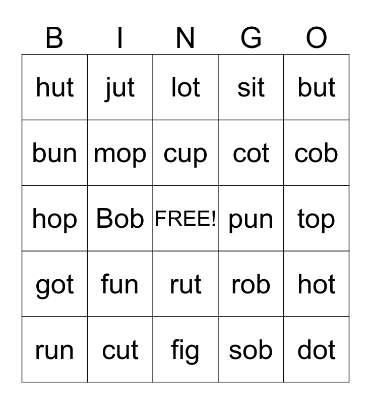 This bingo card has a free space and 24 words: fun, cut, cup, run, but, hut, bun, jut, pun, rut, cot, hop, rob, hot, mop, sob, top, lot, cob, Bob, dot, got, sit and fig.