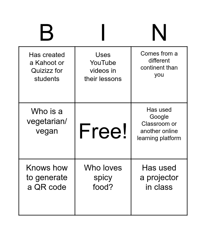 This bingo card has a free space and 8 words: Has used Google Classroom or another online learning platform, Comes from a different continent than you, Uses YouTube videos in their lessons, Knows how to generate a QR code, Has created a Kahoot or Quizizz for students, Has used a projector in class, Who is a vegetarian/ vegan and Who loves spicy food?.