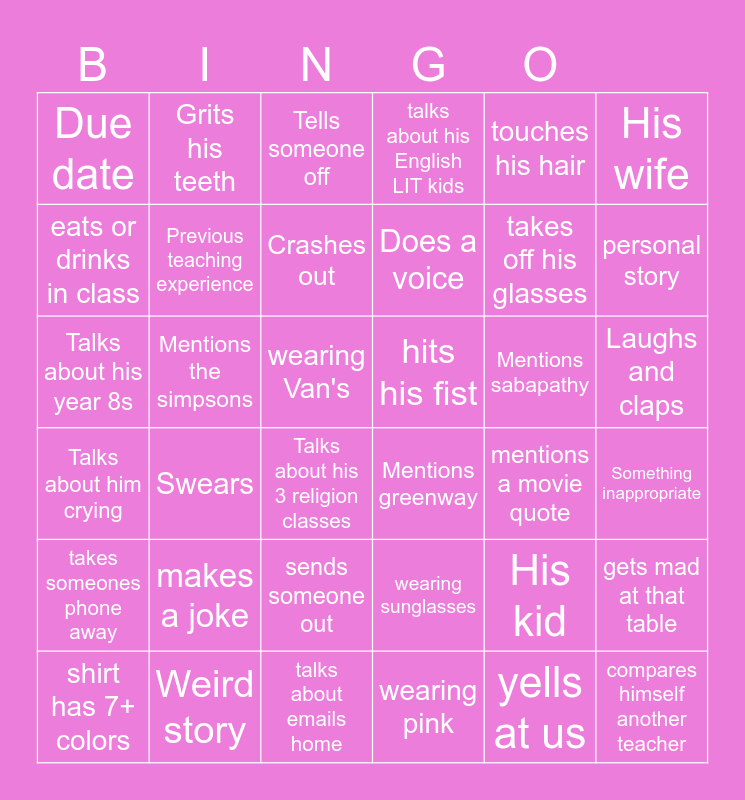 This bingo card has 36 words: Talks about him crying, Swears, talks about emails home, Does a voice, Mentions sabapathy, Laughs and claps, Due date, Weird story, Tells someone off, wearing sunglasses, takes off his glasses, His wife, takes someones phone away, Mentions the simpsons, Crashes out, talks about his English LIT kids, His kid, Something inappropriate, eats or drinks in class, Previous teaching experience, Talks about his 3 religion classes, Mentions greenway, mentions a movie quote, gets mad at that table, Talks about his year 8s, Grits his teeth, wearing Van's, wearing pink, touches his hair, personal story, shirt has 7+ colors, makes a joke, sends someone out, hits his fist, yells at us and compares himself another teacher.