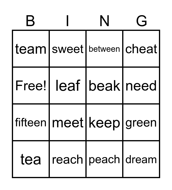 This bingo card has 16 words: reach, green, between, team, fifteen, sweet, keep, peach, Free!, leaf, tea, cheat, meet, need, beak and dream.
