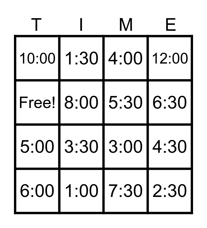 This bingo card has 16 words: 1:00, 4:30, 4:00, 10:00, 5:00, 1:30, 3:00, 7:30, Free!, 8:00, 6:00, 12:00, 3:30, 6:30, 5:30 and 2:30.